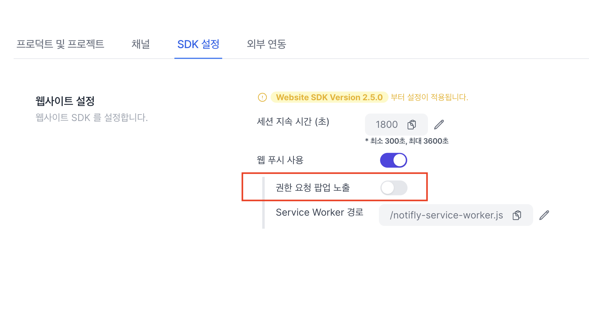 - 노티플라이 콘솔 → 설정 → 웹 푸시 알림 설정 → “권한 요청 팝업 자동 노출”을 ON으로 설정합니다.
